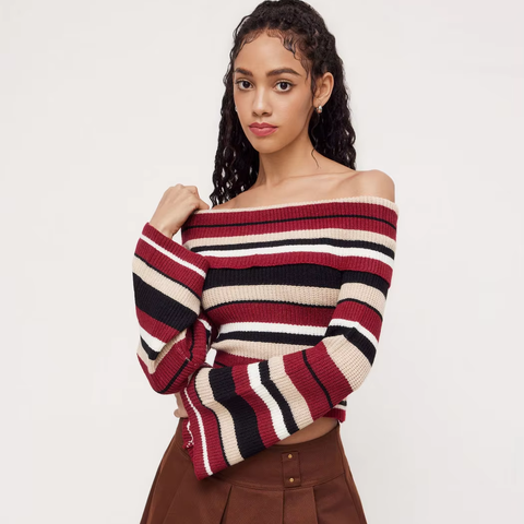 เสื้อถักลายทางเปิดไหล่ข้างเดียวสำหรับผู้หญิงเสื้อสเวตเตอร์ของผู้หญิงสำหรับฤดูใบไม้ผลิและฤดูใบไม้ร่วง