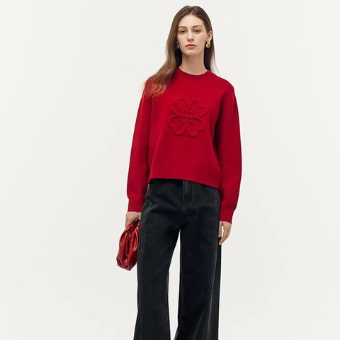 เสื้อถักแบบสวมหัวสีแดงสำหรับผู้หญิงเสื้อผ้าสไตล์ลำลองแบบสวมหัวมีโลโก้ด้านหน้าพิมพ์ลายนูนสามมิติสำหรับฤดูใบไม้ร่วง