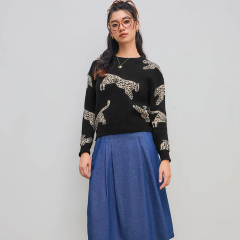 สเวตเตอร์สำหรับผู้หญิงเสื้อสเวตเตอร์คอกลมพิมพ์ลายเสือดาวผ้าวูลสำหรับฤดูใบไม้ผลิและฤดูใบไม้ร่วง